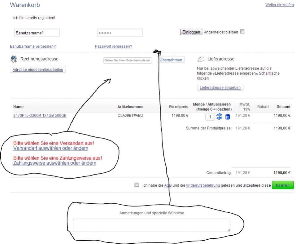 Ich möchte gerne die Zahlungsbedingungen und Versandarten im Warenkorb-Modul zwischen die Rechnungs- und Lieferanschrift verschieben. Natürlich sollen die Versandkosten/Zahlungsgebühren weiterhin im der Auflistung der Beträge erscheinen (also nur der Text und die Auswahlmöglichkeit sollen nach ober verschoben werden). Mit dem Coupon-Code ist es mir gelungen, aber leider nicht bei den Zahlungsbedingungen und Versandarten. Des Weiteren möchte ich gerne die Kundenanmerkungen auch nach oben zwischen den Login und der Rechnungsadresse verschieben. Auch hier habe ich Probleme mit dem Speichern der eingetragenen Daten, da es scheinbar mit dem Kaufen-Butto zusammenhängt. Ich füge man eine JPG-Datei zur besseren Verständlichkeit bei.