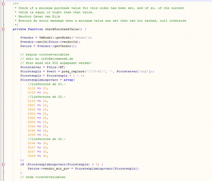 Man sollte in dem Array die PLZ -> Mindestbestellwert anpassen und unten den Text ebenso