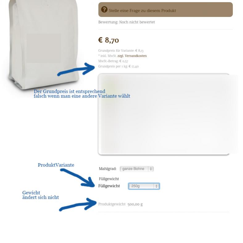 Das erste Problem ist, ich verkaufe Kaffee und habe von meinen Kaffees jeweils 2 Gewichtsvarianten. 250 und 500g. Der Grundpreis wird immer per Kilo angezeigt.
