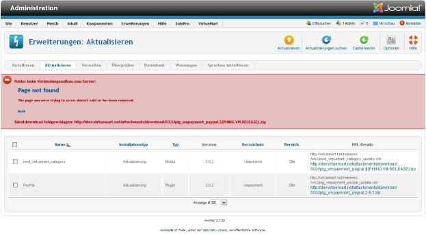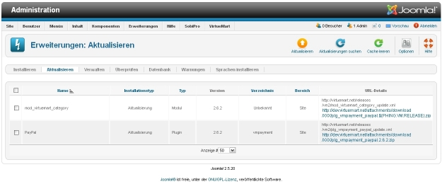 Gleich danach wurden mit im Joomla-Backend zwei Aktualisierungen angezeigt.
