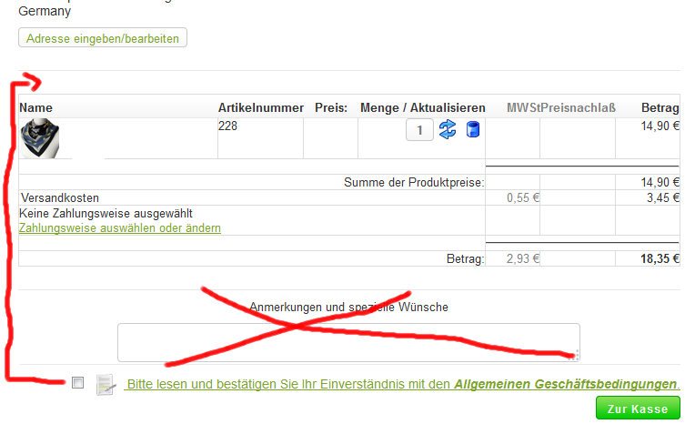aus rechtlichen Gründen ist es nötig, dass ich das Layout des Warenkorbes ändere. Zwischen dem Button "Zur Kasse" oder "Kaufen" und den Angaben zum Artikel darf nichts stehen. "Bitte lesen und bestätigen Sie Ihr Einverständnis mit den Allgemeinen Geschäftsdingungen" (schlechtes Deutsch, das sollte geändert werden) und auch "Anmerkungen und spezielle Wünsche" und das dazughörige Eingabefeld dürfen dort nicht stehen (laut Aussage des Anwalts).