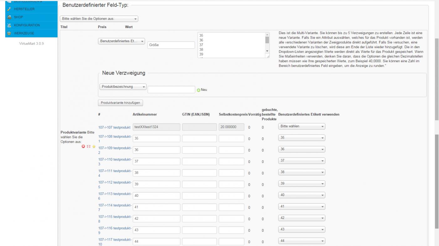 > Um jetzt noch die Mengen einzutragen gehen wir auf ein Child Produkt, zum Beispiel Größe 35 in Schwarz. Um dieses zu finden, wäre es gut für jede Größe und Farbe eine eindeutige Artikelnummer zu bestimmen.