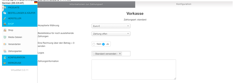 2. In der Zahlungsart den Bestellstatus für noch ausstehen Zahlungen auf Zahlung offen (siehe 1) gesetzt