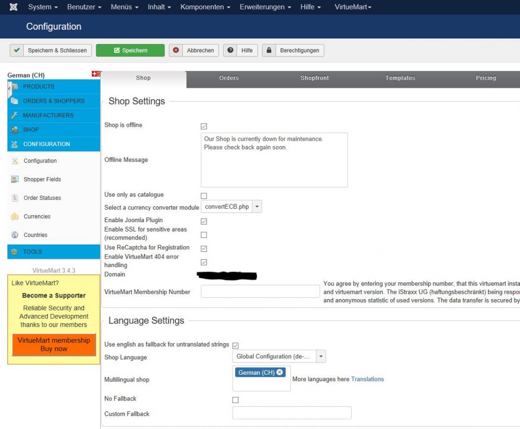 Im Backend von Virtuemart scheint die Übersetzung auch zu funktionieren. Dort werden die Texte in Deutsch angezeigt.
