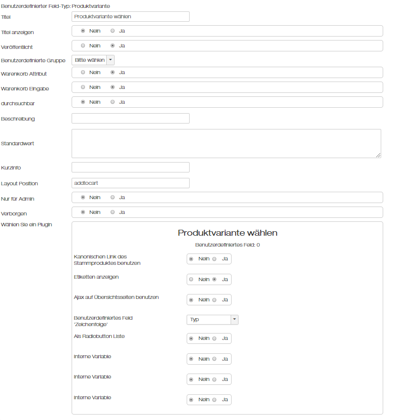 Sie sind als Warenkorb-Attribute angelegt und werden auch sauber an die Produktvarianten vererbt.