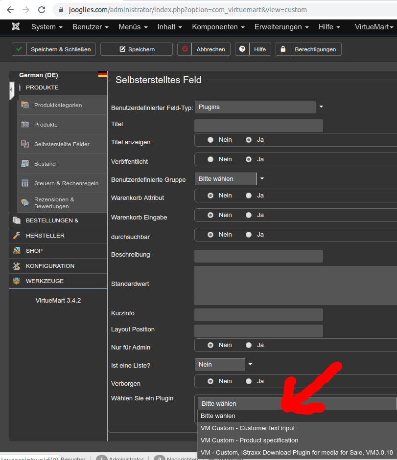 Ich habe ein neues Benutzerdefiniertes Feld vom Typ Plugin angelegt, alle Einstellungen unverändert gelassen (Titel anzeigen und Veröffentlicht auf Ja, sonst alles auf Nein).