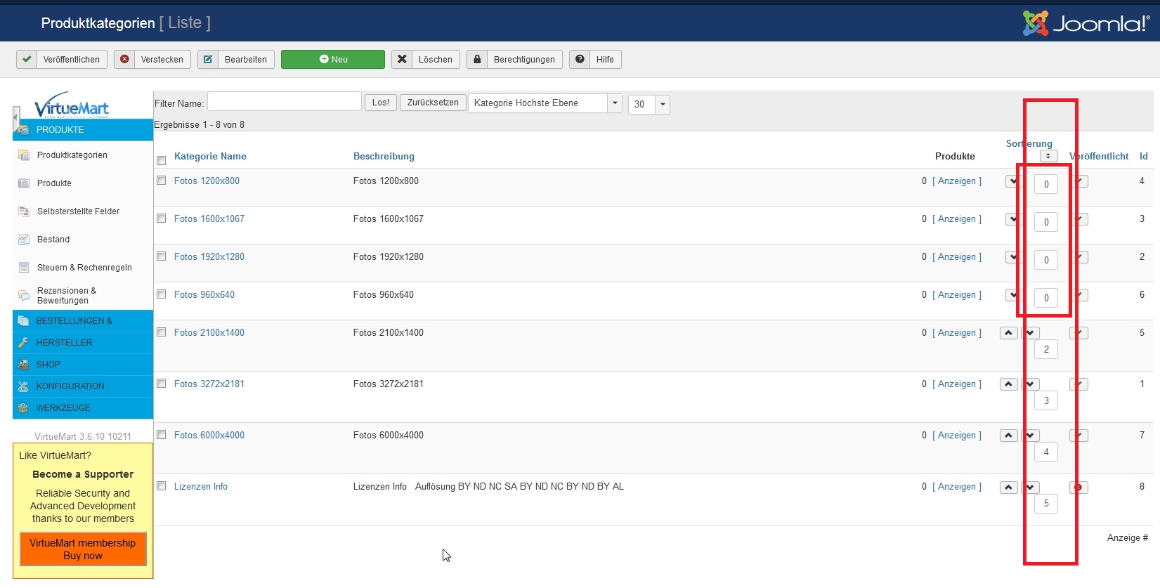 Dazu habe ich zunächst die Produktkategorien für die Fotos - nach Auflösungen - erstellt. Und dabei ist mir aufgefallen, dass die Sortiernummer auf "0" gesetzt wird sobald ich etwas bearbeite. Damit kann ich aber dann die Kategorien nicht sortieren. Ich kann weder die einzelnen Zeilen verschieben noch nummerieren, es funktioniert nicht.