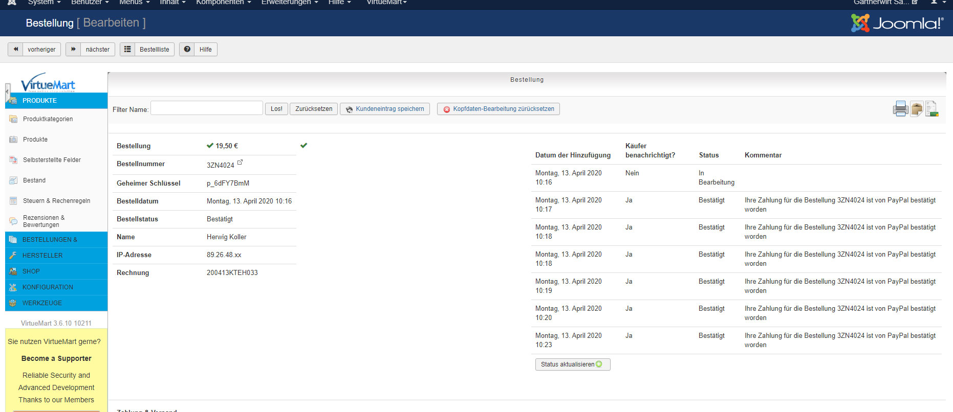 Ansonsten würde ich eine Testinstallation parallel aufsetzen und einmal die neue Beta-Version von VirtueMart testen, die unter dev.virtuemart.net zu finden ist: 3.6.11.10302 zum heutigen Zeitpunkt.