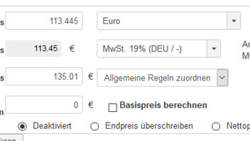Der Bruttopreis eines Produktes wird bei mehreren, aber nicht allen Produkten mit einem 1 Cent mehr anzeigt. Bei diesen Produkten wird die Mehrwertsteuer mit 19% berechnet.