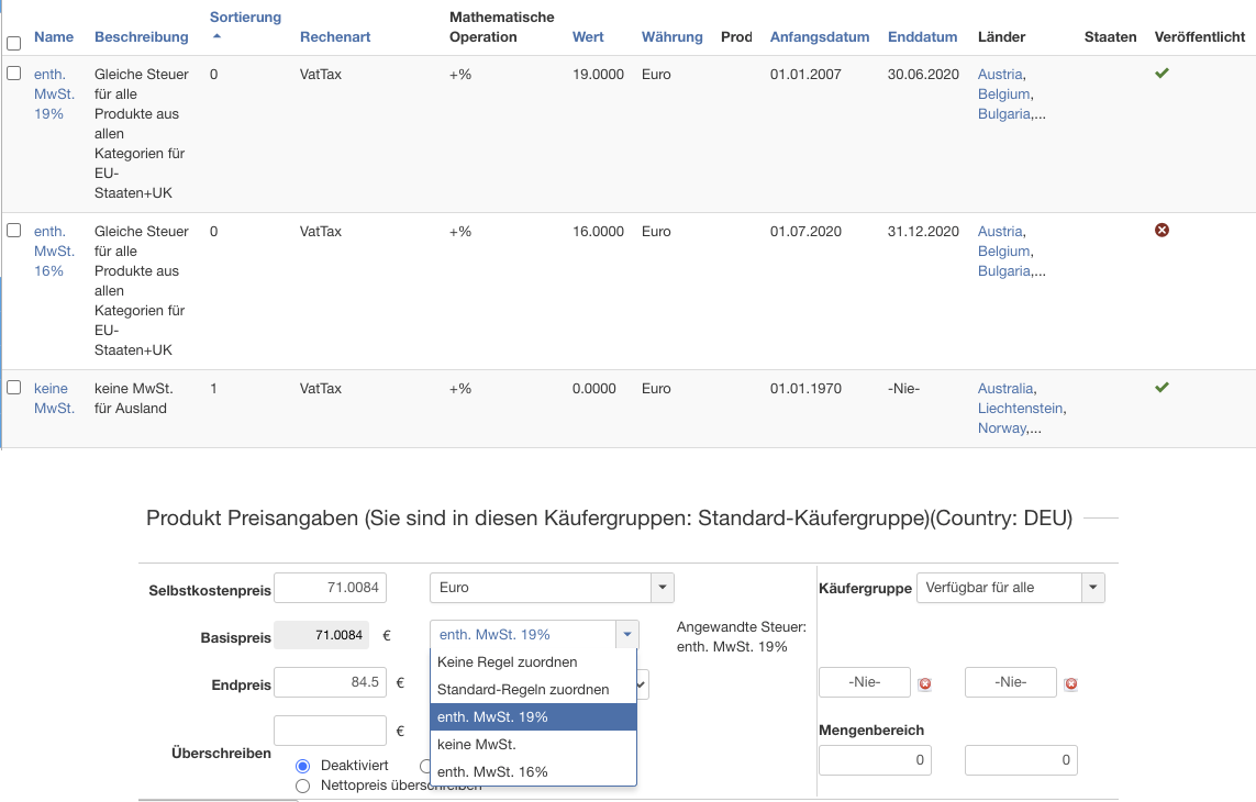 Bei der Steuerregel also nicht "verfügbar für alle", sondern Hersteller und Produktkategorie festlegen und dann beim Produkt "Standard-Regeln".