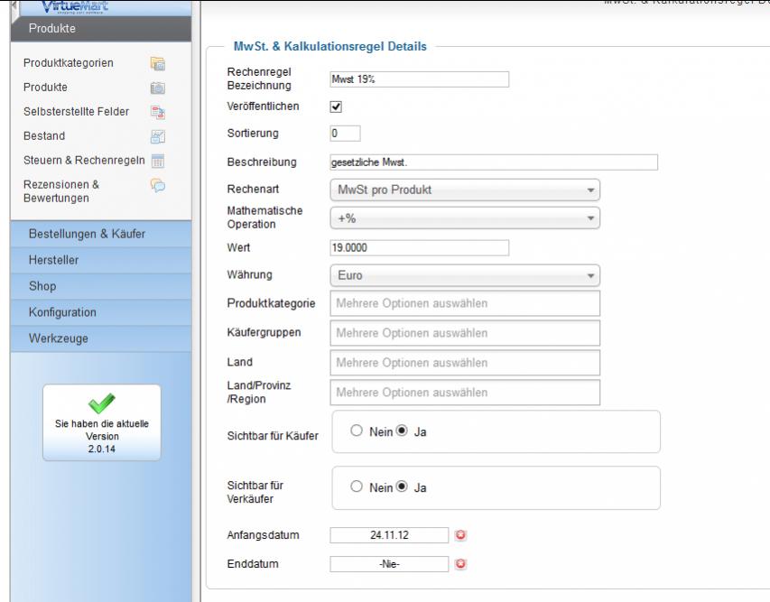 Ich benutze Virtuemart 2 und Joomla 2.5.8. Nach der Installation des Shops habe ich einige Produkte eingegeben. Auf der Frontseite werden mir auch wie gewünscht die Bruttopreise angezeigt.