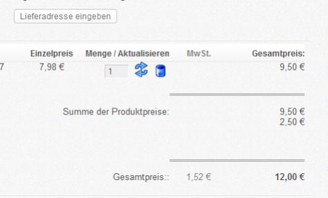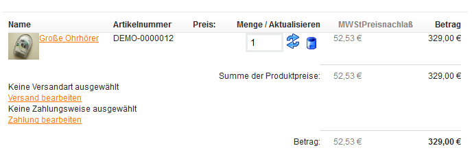 Sobald ich aber Artikel im Warenkorb habe und mir den anzeige, zeigt er in der Spalte "Preis" den Nettopreis an und hinten den Bruttopreis als "Betrag" entsprechend der Anzahl meiner gewünschten Artikel.