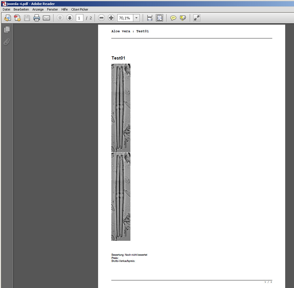 Erstens wird ein Produkt Bild zweimal untereinander mit im pdf ausgegeben.