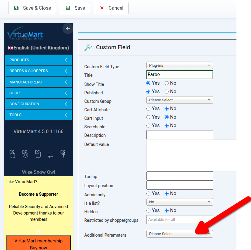 Ich wollte ein selbsterstelltes Feld anlegen, jedoch kommt das als Fehlermeldung: Please select the plugin on bottom of the page at "Additional Parameters"