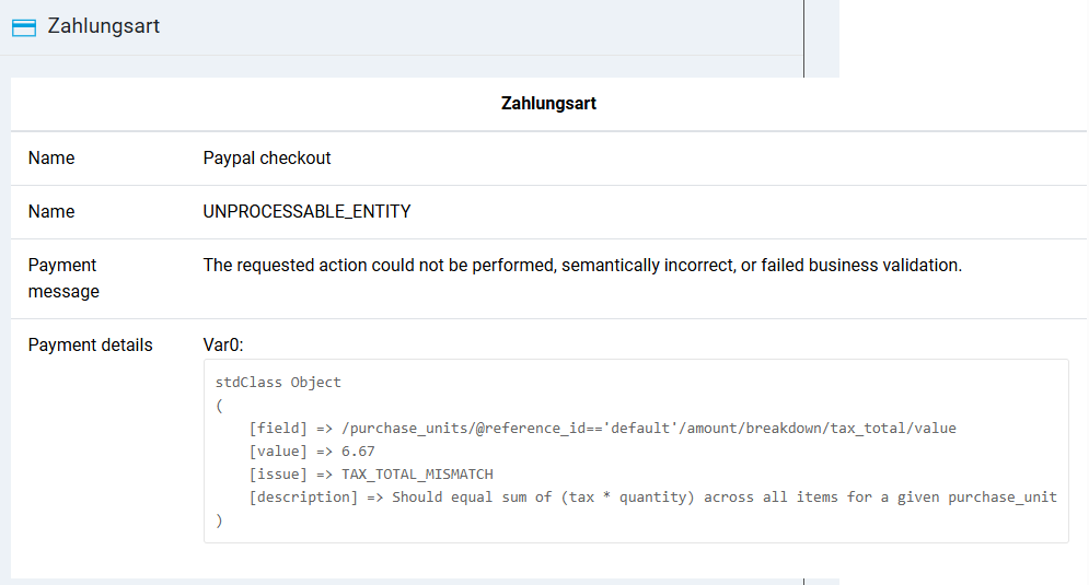 Liebe Mitstreiter In der Version 4.6.2 haben wir teilweise Probleme beim PayPal Checkout, UNPROCESSABLE_ENTITY gesamte Fehlermeldung im Anhang aus der Meldung werde ich leider nicht ganz schlau.