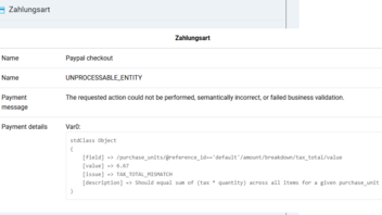 Liebe Mitstreiter In der Version 4.6.2 haben wir teilweise Probleme beim PayPal Checkout, UNPROCESSABLE_ENTITY gesamte Fehlermeldung im Anhang aus der Meldung werde ich leider nicht ganz schlau.