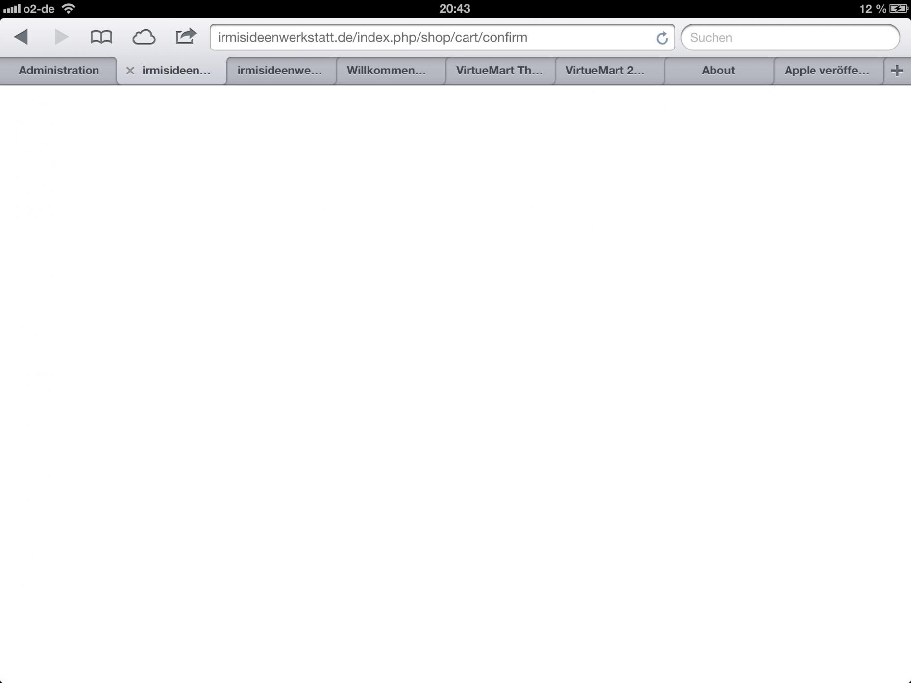 ich bin neu hier und habe mir im inet schon nen wolf gesucht :D, ich bin grad dran ne Webseite mit Shop zu erstellen, dies hat auch alles reibungslos geklappt, allerdings wenn ich im Shop Einkaufe ( bisher nur als Test) habe ich das Problem das ich beim letzen Schritt (4) nach dem ich auf kaufen klicke nur eine leere Seite (siehe Bild) angezeigt bekomme. Bestellung geht dennoch raus, sobald ich neu lade geht wieder eine Bestellung raus und Seite bleibt weiß und so weiter und soweiter.