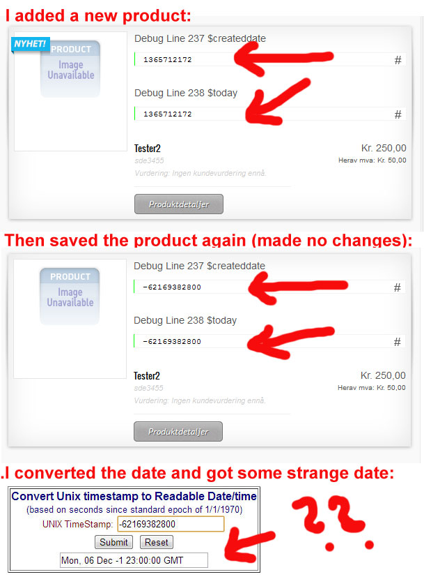 Wenn wir ein neues Produkt hinzufügen und speichern, das Produkt bekommt die richtige "created_on" Datum. Und wenn wir das Produkt erneut speichern, die "created_on" Datum ist an einem falsche Datum geändert.