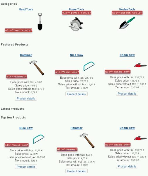 Warum werden die Alt Attribute nur auf der Startseite angezeigt und in der Kategorie, Detailansicht und den Neusten Produkten usw. nicht?