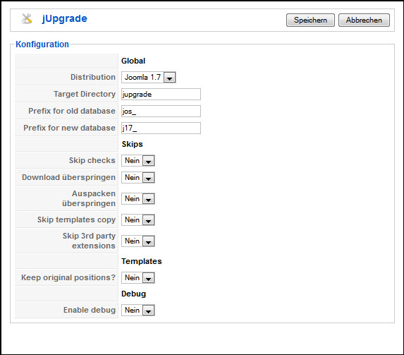 - Sollte Ihr Skript aus einer Joomla! 1.0 Installation stammen, klicken Sie auf die Checkbox „Dieses Skript ist ein Joomla! 1.0 Migrationsskript“.