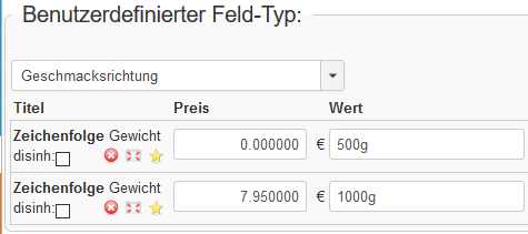 Jetzt habe ich ein Variables Feld erzeugt, dass ich das gleiche Produkt aber auch mit einem Gewicht von 1000g bestellen kann und dass das dann 8,51€ mehr kostet. Also 1000g 17,50€. alles in allem 48Cent günstiger im Gegensatz zu 2mal 500g.
