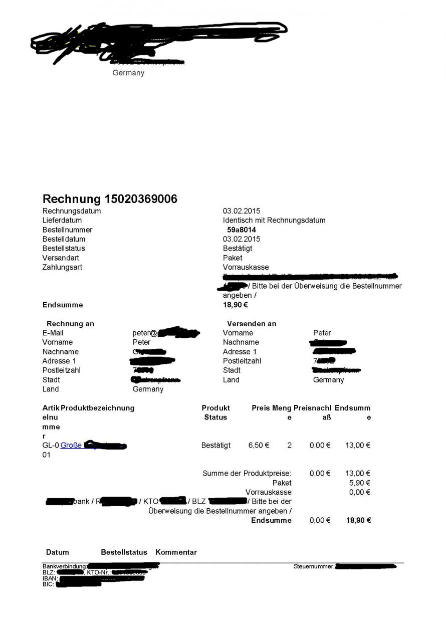 bei registrierten Käufern ist es richtig, dass man sich die Bestellung/Rechnung noch einmal anschauen kann. Ich habe den Shop aber so eingestellt, dass man auch als "Gast" bestellen kann. Diese können sich die Bestellungen/Rechnungen im Frontend natürlich nicht noch einmal anschauen. Das ist aber auch gar nicht das Problem.Ich möchte die Formatierung des automatisch erstellten PDF (im Frontend sieht es ähnlich aus) ändern, so dass eine ordentliche Rechnung erstellt wird. Wie es im Moment aussieht erkennt man an dem beigefügten Bild.