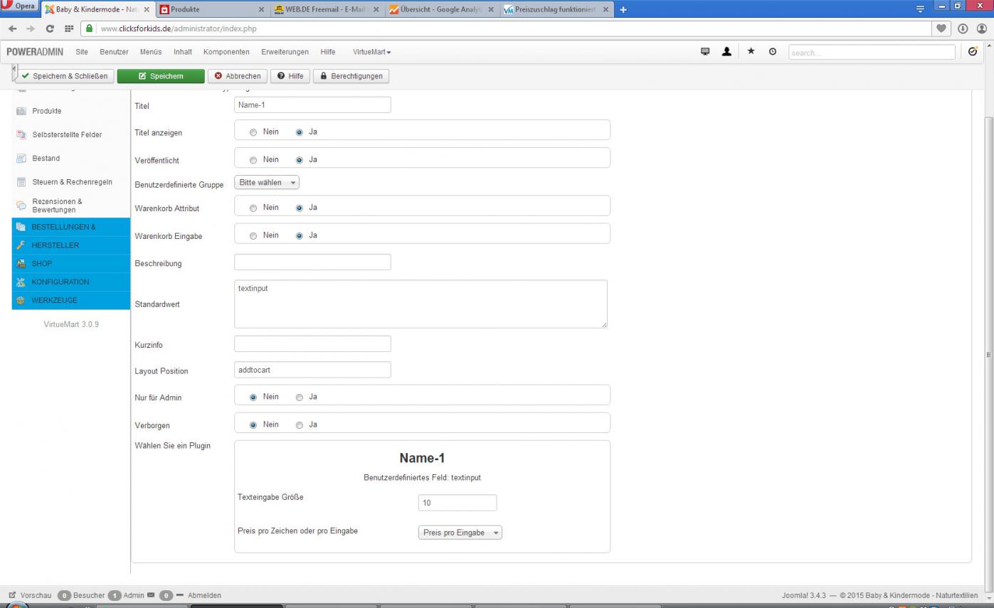 Selbsterstelltes Feld: Name: Benutzerdefiniertes Feld: textinput . Warenkorb Atribut Ja, Warenkorbeingabe ja