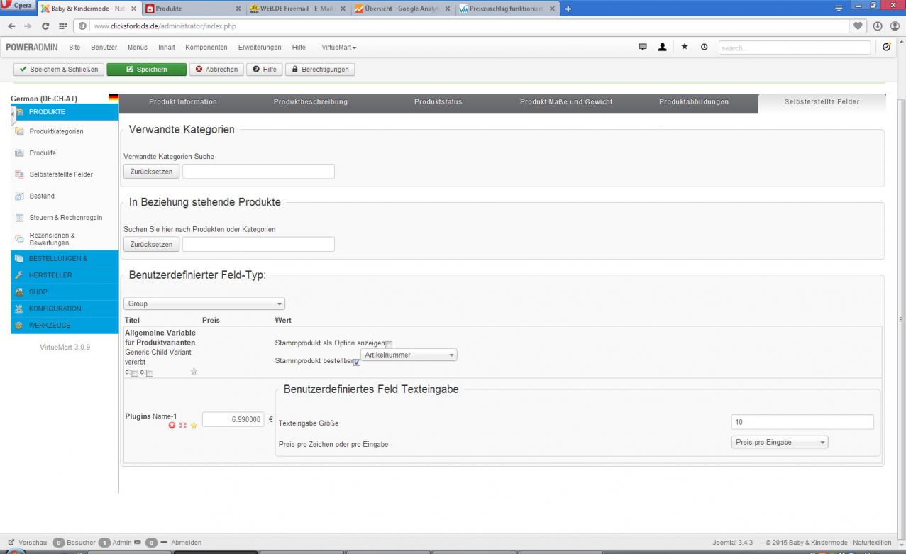 vielen Dank für den Tip. Leider komme ich nicht zu einer Lösung. Das selbsterstellte Feld habe ich bereits angelegt. Text as input. Auch habe ich bereits das Template gewechselt Hot_baby-Shop. In der VM 2.xx war es so einfach. Falls ich keine andere Lösung finde, muss ich wohl mit den Produktvarianten arbeiten. Vielleicht hat hier ja noch jemand einen Tip, ich bin für alles offen.