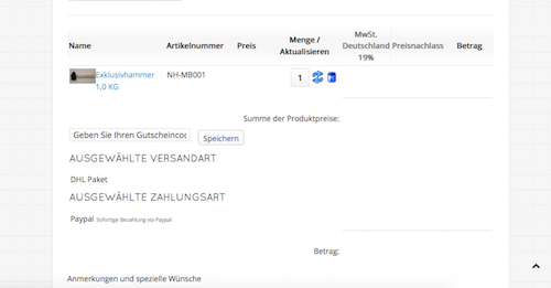 Und zu guter letzt: Auch im Warenkorb sind keinerlei Preise ersichtlich. Im Backend ist alles nach bestem Gewissen eingetragen - und wird auch angezeigt.
