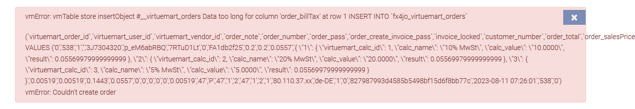 vmError: vmTable store insertObject #__virtuemart_orders Data too long for column 'order_billTax' at row 1 INSERT INTO `fx4jo_virtuemart_orders`