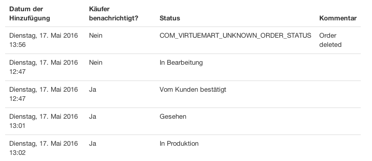 Eine Frage habe ich noch. Seit ich auf 3.0.16 Umgestellt habe kommt wenn die Bestellung aufgegeben wurde beim Bestellstatus am Anfang immer "COM_VIRTUEMART_UNKNOWN_ORDER_STATUS" und das Datum und die Uhrzeit stimmt auch nicht immer. Weißt du vielleicht woran das liegen kann? Anbei auch ein Bild zur Veranschaulichung.