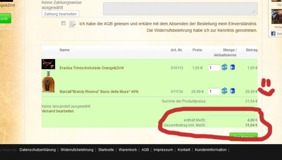 Beispiel: "Trinkschokolade" Preis 1,65 € (7% MwSt) +