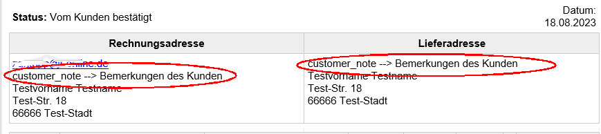bei der Bestätigungsmail des Kunden stehen über Versand- und Rechnungsadresse jeweils die Bemerkungen des Kunden (customer_note). Dieses würde ich gerne entfernen und habe sie bereits an einem passenden Platz eigefügt. Leider kann ich nichts finden wie dieses Feld entfernen kann. Siehe Screenschot im Anhnang.
