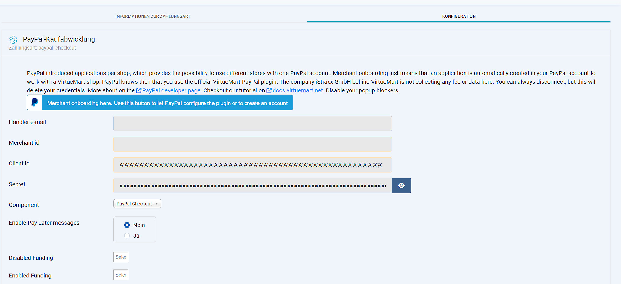 Händler E-Mail und Merchant id werden hier scheinbar nicht gebraucht und sind ausgegraut.