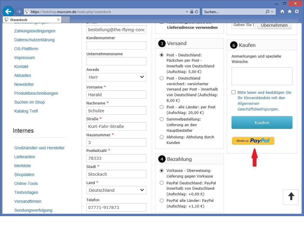 Die Kundin die sich bei mir gemeldet hatte, hatte insgesamt 5 Artikel bestellt und sie wahrscheinlich zuerst "normal" in den Warenkorb gelegt und hat dann im Warenkorb den Button "Direkt zu PayPal" (gelber Button) benutzt und da gibt es auch bei mir immer Fehlermeldungen, egal welche Einstellungen ich benutze...