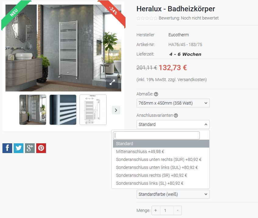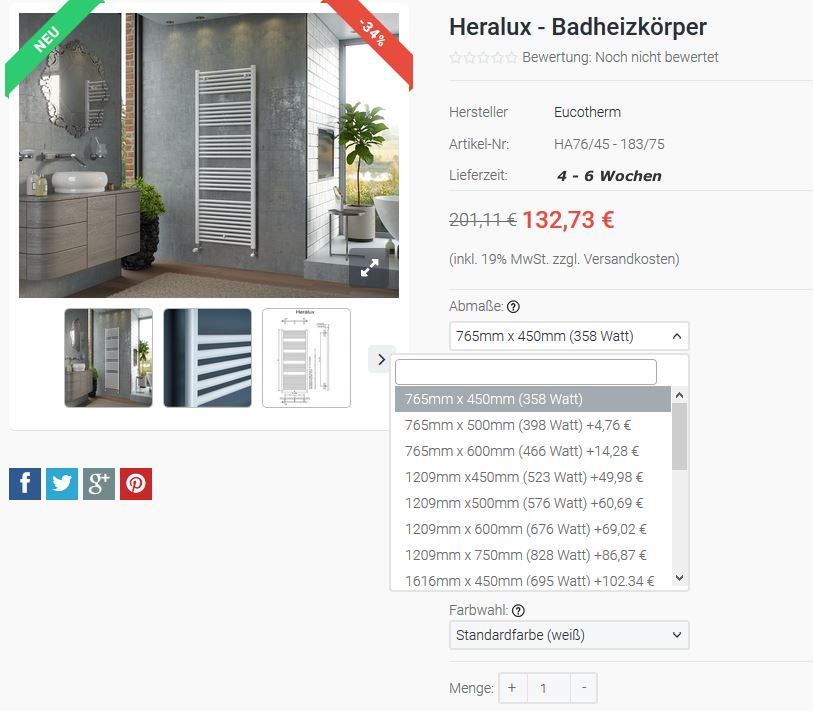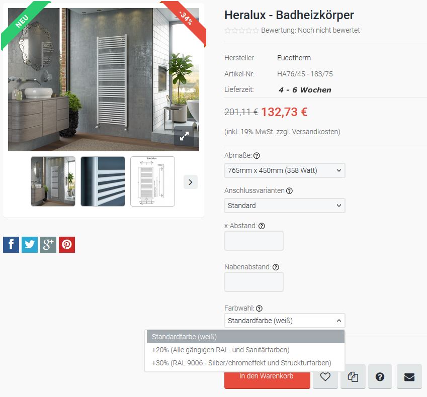 Auf den ersten 3 Bildern siehst du die Auswahlboxen die ich benötige, das klappt auch wunderbar mit der Berechnung wenn eine Auswahl getroffen wird. Wenn noch keine Auswahl getroffen wurde zb. von Abmaße oder Anschlussvarianten und der Standardpreis (132,73 €) noch dort steht funktioniert die Auswahlbox Farbwahl einwandfrei, er rechnet die 20% oder 30% perfekt auf die Summe 132,73 €. Nur sobald ich eine andere Abmessung auswähle und der Preis oben verändert sich wird mit der Farbwahl nicht mehr der korrekte Wert in Prozent hinzugerechnet, er rechnet dann die differenz von 132,73 € zu aktuellen Preis hinzu und das ist falsch.