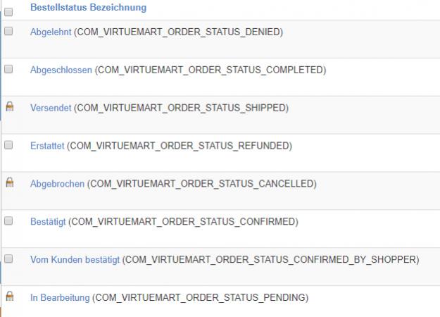 ich nutze VirtueMart 3.2.14 mit dem deutschen Lokalisierungspaket. In den Bestellbestätigungen/Rechungen wird komischerweise Deutsch und Englisch gemischt, obwohl in den Übersetzungspaketen die entsprechenden Variablen enthalten und Übersetzt sind. Das betrifft bei mir auch den Bestellstatus. Im Backend sieht soweit alles gut aus (ist richtig übersetzt).