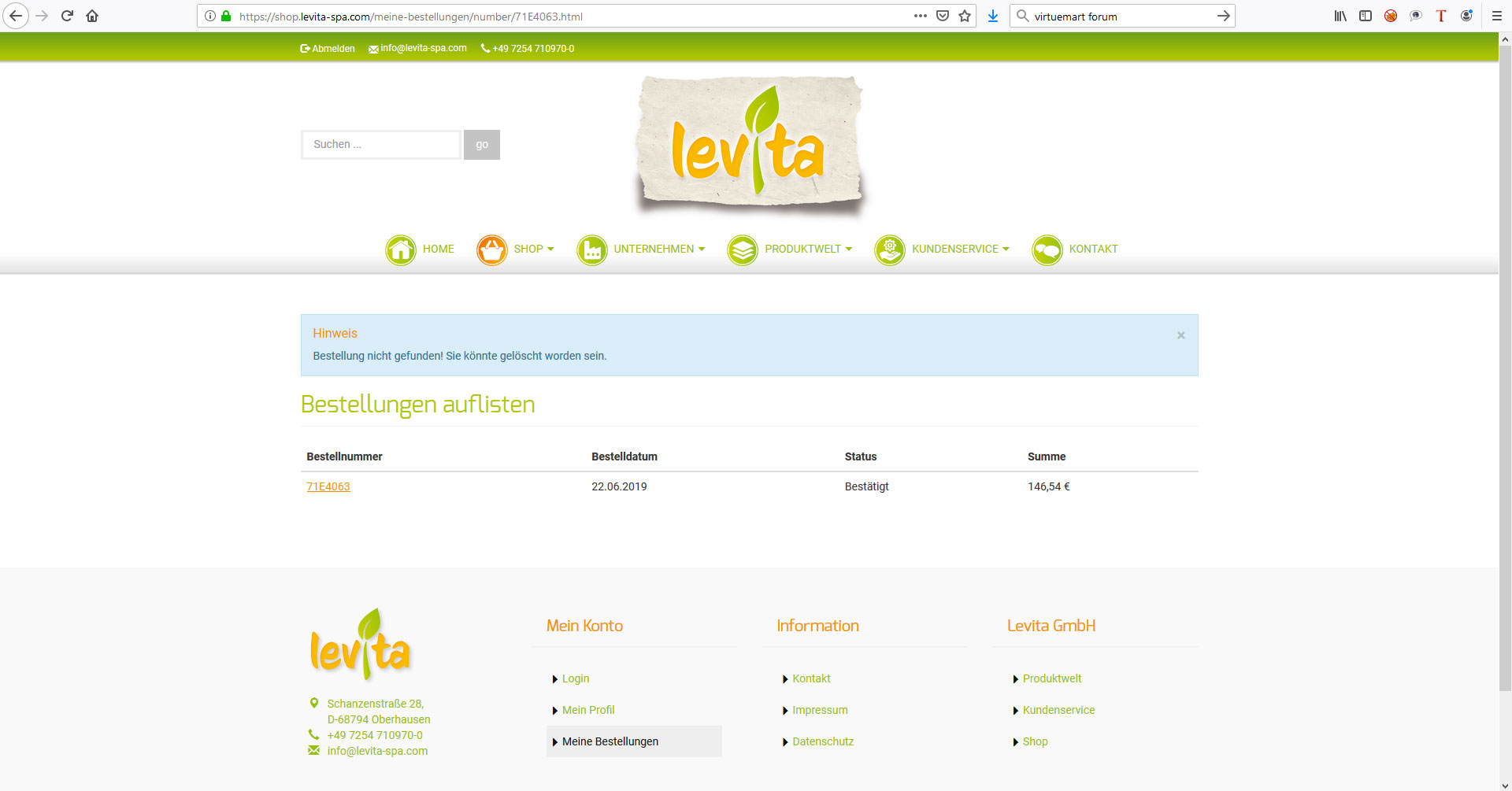 Wenn man zu seinen Bestellungen geht, kommt man zur Seite "Bestellungen auflisten". Dort kann man zwar seine Bestellung anklicken, es kommt aber nur eine Fehlermeldung, dass die Bestellung nicht gefunden wurde (siehe Screenshot). Dasselbe passiert, wenn ich bsw. über Kreditkarte bestelle. Da kommt ein Button "Bestellung ansehen" und es passiert das gleiche.