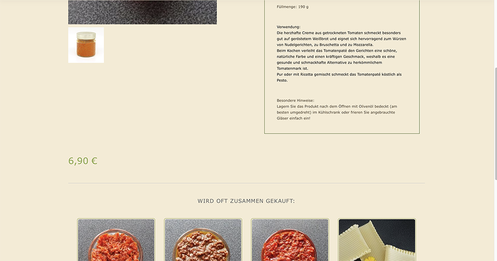 Auf dem Screenshot sieht man eine Einzelproduktseite und unten die related products. So weit, so gut. Den Bereich "wird oft zusammengekauft" habe ich natürlich als selbsterstelltes Feld konzipiert.