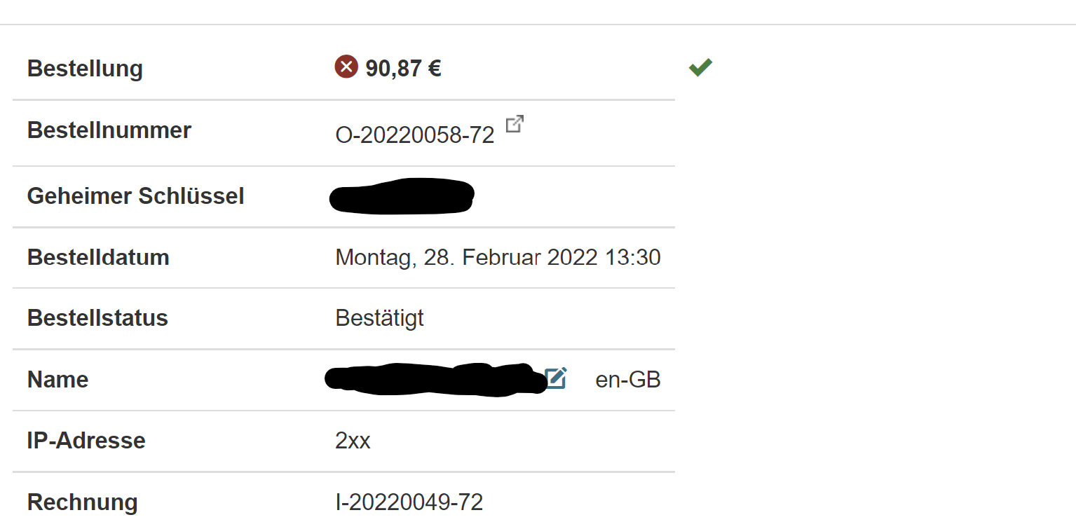 So wenn ich die Rechnung vorher erstellt habe, muß ich beim Bestätigen die Rechnungserstellung verbieten, da sonst eine zweite Rechnung erstellt werden würde. Auch kein Problem, aber der Status des Geldeingangs wird nicht aktualisiert. Der Marker hinter dem Betrag ist rot mit einem Kreuz versehen, der Betrag steht da aber ich kann nicht auf bezahlt umstellen. Ich habe schon versucht in den db einen Unterschied zu bezahlten Rechnungen zu finden, aber da gibt es nichts was abweicht.