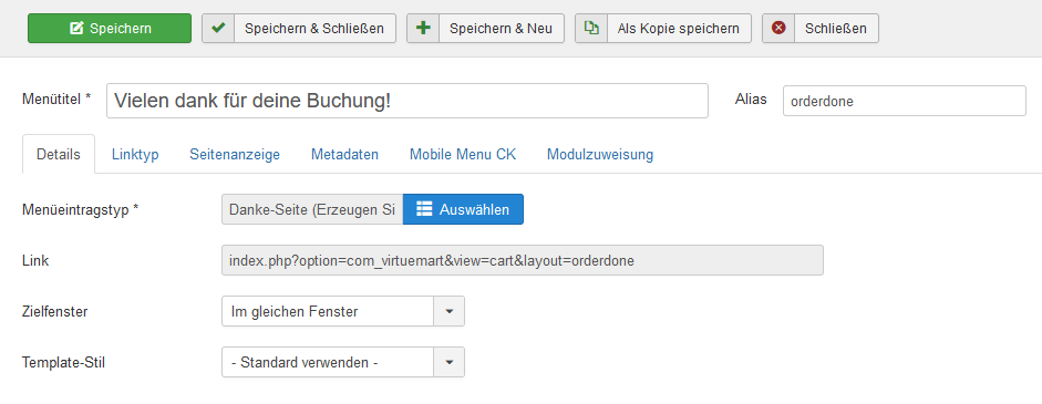 Einen anderen Menüpunkt für die VirtueMart Dankeseite habe ich nicht. Habe ich einen Denkfehler?