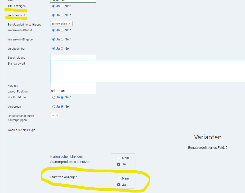 Bei dem selbsterstellten Feld "Multivarianten" habe ich "Etiketten anzeigen" = Ja