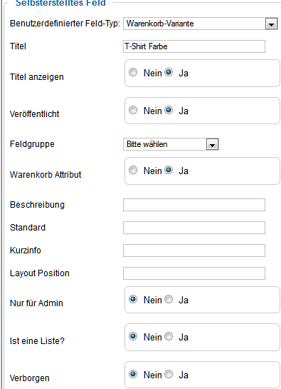 bei benutzerdefinierter Feldtyp Warenkorbvariante( z.B. T-Shirt Grösse) muss das Warenkorbattribut aktiviert sein.(auf ja)