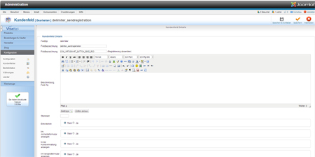 ja, mit den selbsterstellten Felder beschäftige ich mich noch immer. Ich habe da bis jetzt keine Lösung gefunden, um eine -auswahl nur Backend vorzunehmen. D. h. ich möchte im Backend ein Liste haben, wo ich auswählen kann, wo der Eventort ist. Sagen wir mal ich, habe 7 Orte zur Auswahl und ein bestimmter Event (=Produkt VM) findet nur dort statt. Dieser Ort soll dann auch nur im Frontend angezeigt werden.