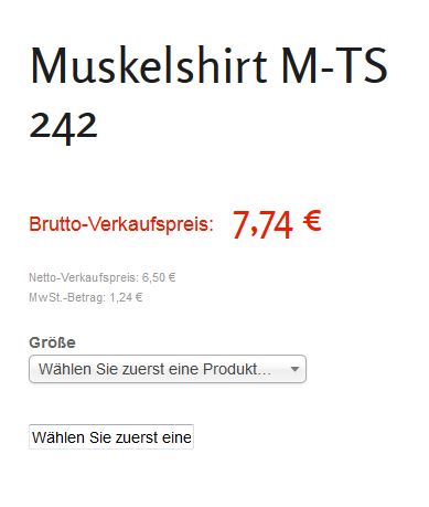 Wenn man jetzt im Shop das T-Shirt (Hauptprodukt) anwählt, sehe ich das Produkt mit der Auswahl der verschiedenen Größen.