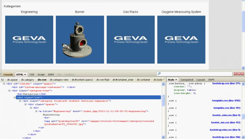 Unten rechts sieht man, dass die Bootstrap-CSS-Dateien alle die Klasse row angeben, ich hab überall margin-left herausgenommen, nun ist alles zentriert.