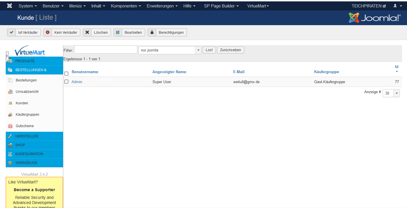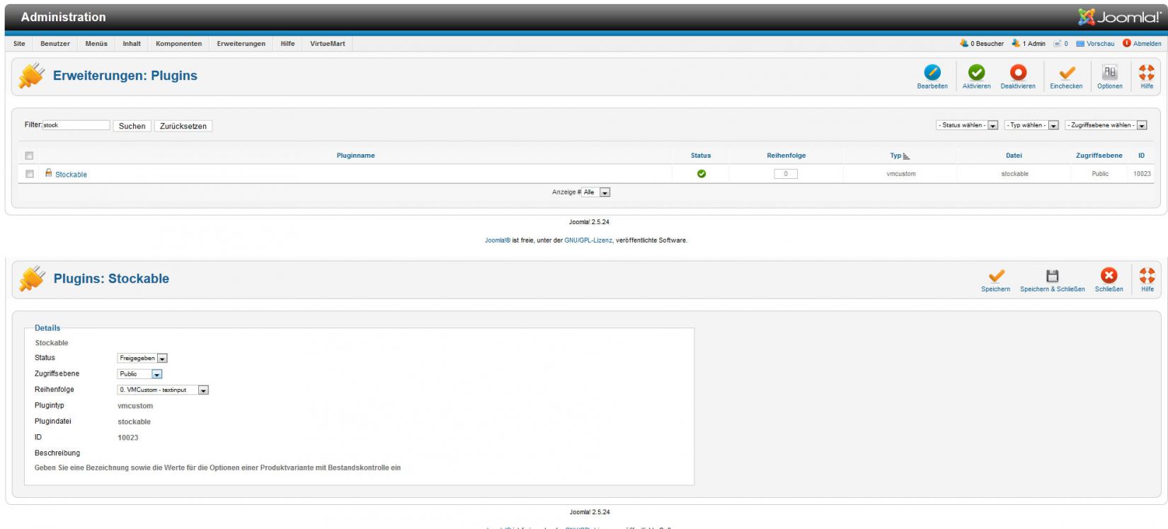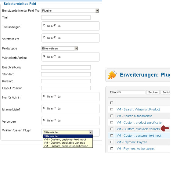 Auf Grund dieser Auswahl haben wir dann im Dialogfeld ganz unten eine Auswahlliste "Wählen Sie ein Plugin". Dort wählen wir "VM customs, stockable variants". (in meinem Fall steht dort nur "stockable"?)