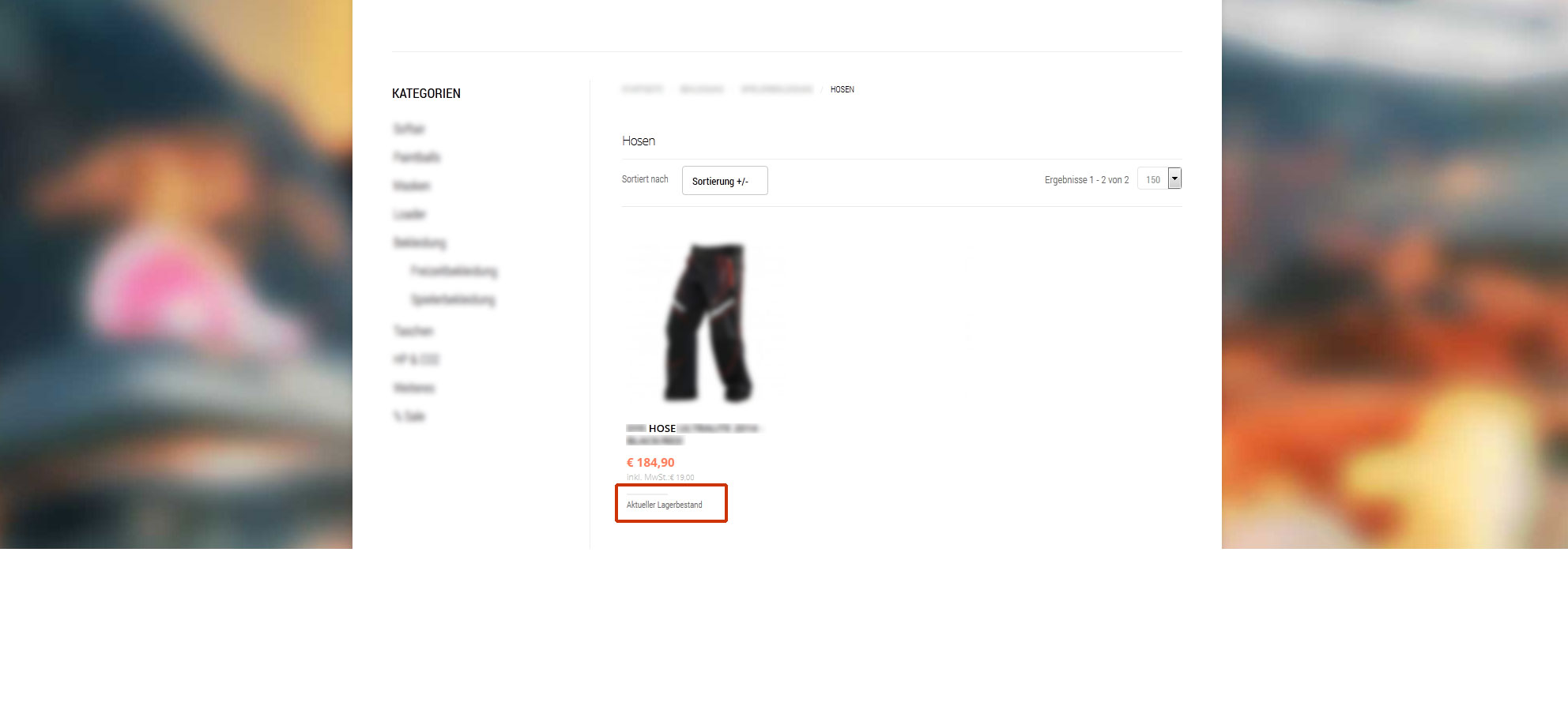 Auf der Kategorieseite sieht man bereits dass der Lagerbestand gleich "0" ist. (Stammprodukt ist auf "Vorrätig" 0 gesetzt, während die unterschiedlichen Größen Lagerbestand haben).