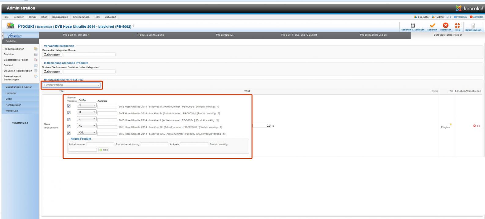 Darufhin sind alle Produktevarianten dieses Stammproduktes dort untereinander aufgelistet und die Optionen (S, M, L, XL, XXL) können den Varianten zugeordnet werden.