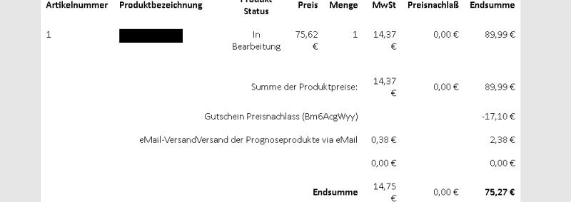 Wenn diese Rechnung mein Steuerprüfer in die Hände bekommt wird er anmahnen, dass zu den 17,10 Rabatt noch 19% UmsSt. hinzukommen, also ich der Gutschein einen Gesamtwert von EUR 18,29 hat. Im Endeffekt wär das Steuerhinterziehung von 1,19€ par exzellence.